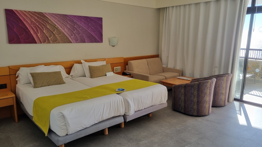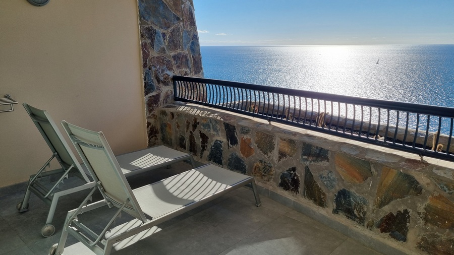 I simply love the place. It’s nestled right on the cliffs above the ocean and yes, you hear the waves crashing all the time! It’s music to my ears.. Big rooms, a bit worn but not too bad. Huge balconies, fantastic breakfast and a free bottle of cava when you arrive. You can’t go wrong with that!