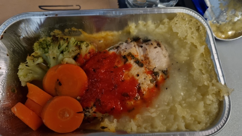 The meal on the flight back from MIA was much better! Chicken breast, dry of course but heated correctly. Veggies, potato mash, a squishy white bread again.